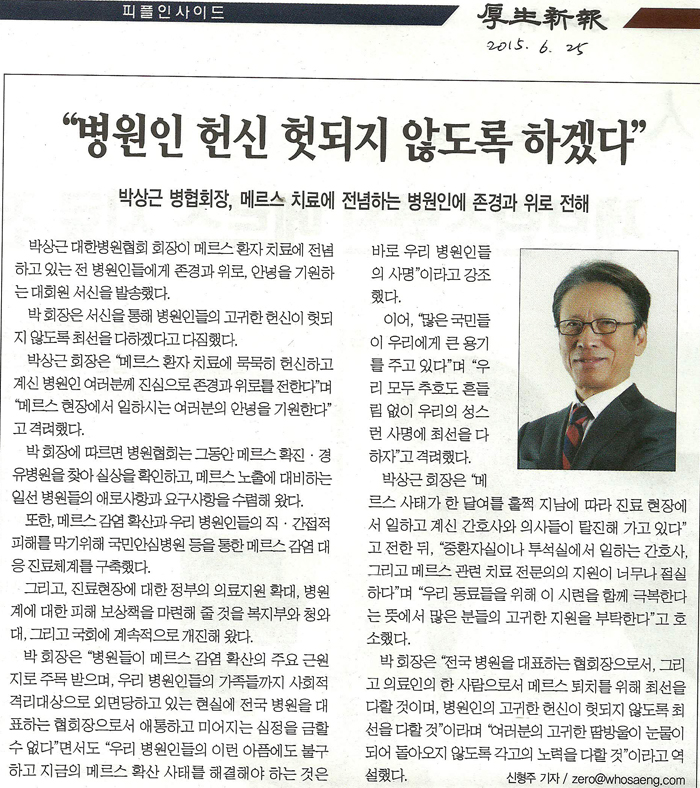 | 278 | 박상근 명예회장님 컬럼,"병원인 헌신 헛도지 않도록 하겠다" |