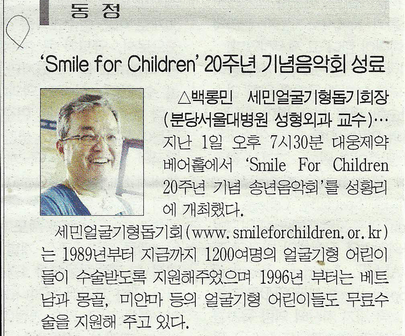 | 305 | 백롱민부회장님 "Smile for Children" 20주년 기념음악회 성료 |